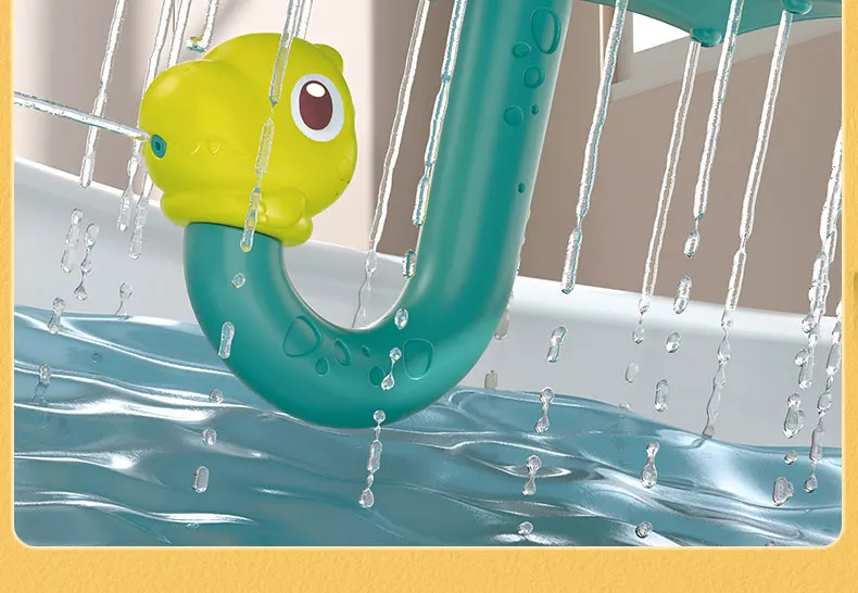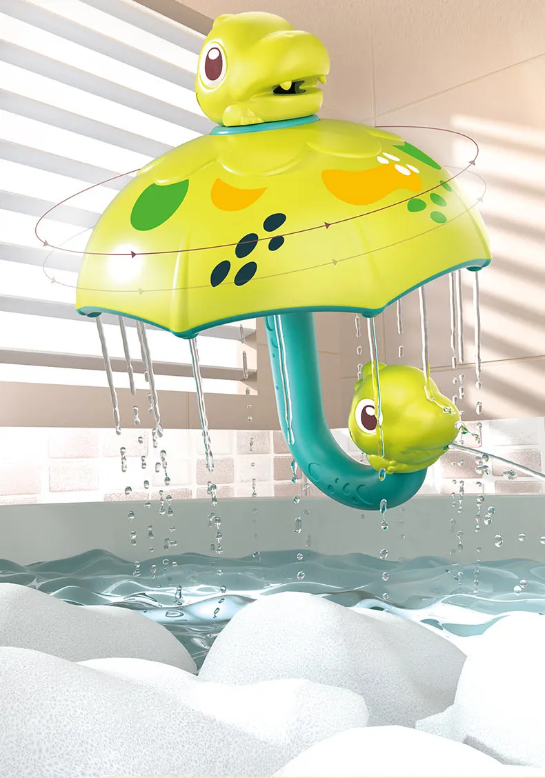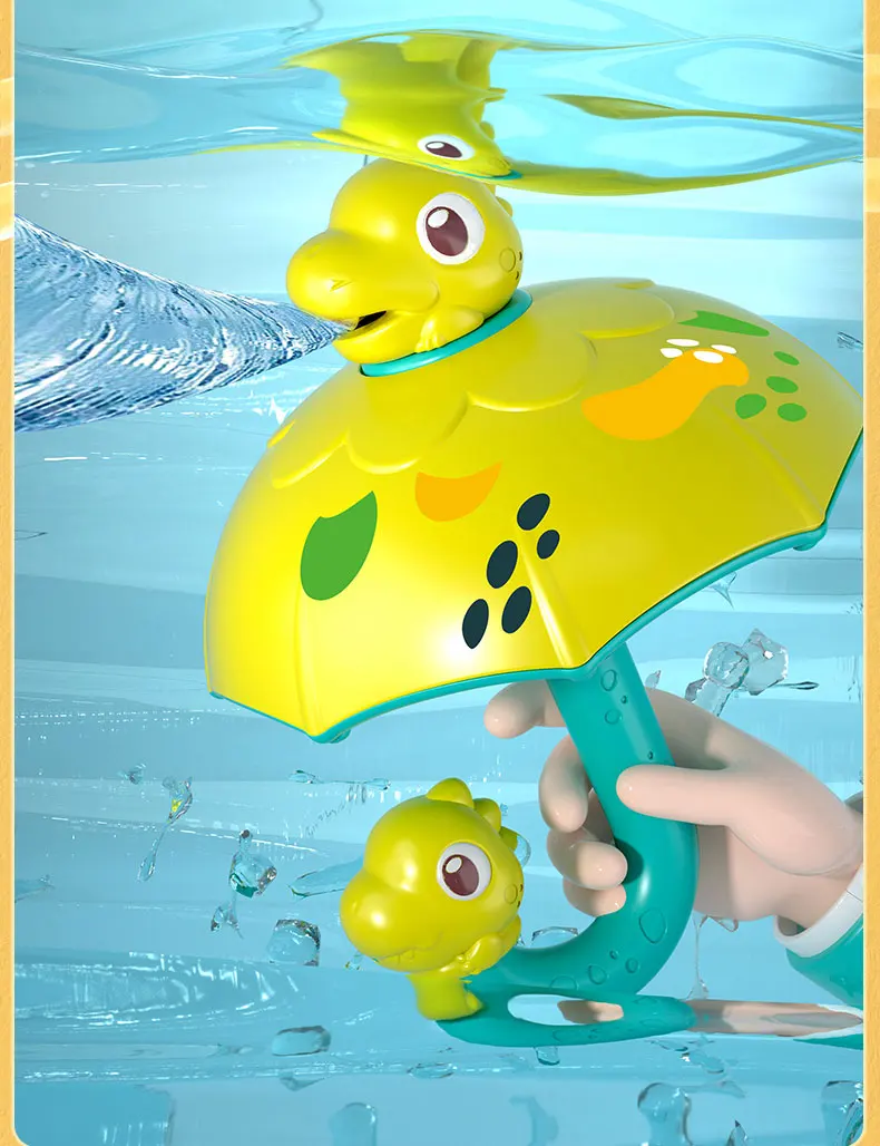 Chuva Divertida de Dinossauro: Com um design super fofo de dinossauro e guarda-chuva, basta submergir o brinquedo na água para que ele se encha automaticamente. A água escorre suavemente pelas bordas do guarda-chuva e pela boca do dinossauro, criando um efeito de "chuva" cativante e suave para a pele do bebé.