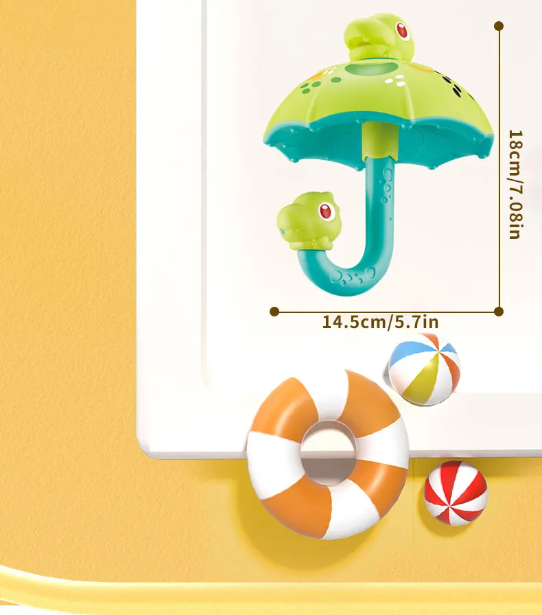 Estimula a Curiosidade e a Força das Mãos: As crianças podem girar a cabeça do dinossauro e a alça do guarda-chuva para explorar diferentes fluxos de água, exercitando a força das mãos e a curiosidade sobre como a água se move.